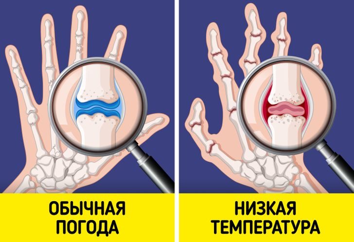 Это относится к тем, у кого от перемены погоды ломит кости. Снижение атмосферного давления вызывает боль и воспаление суставов, особенно у людей, страдающих артритом. При низких температурах жидкость внутри суставов густеет, из-за чего они становятся менее подвижными.