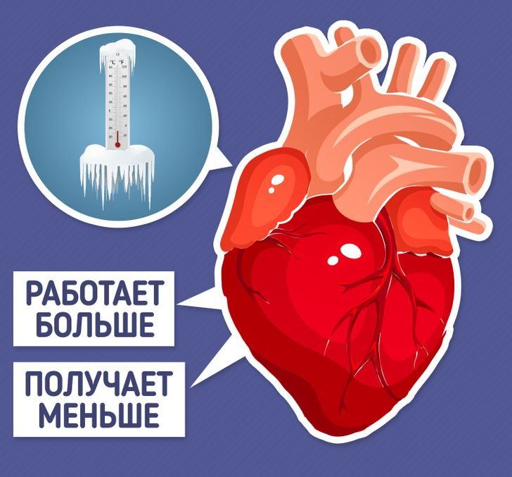 Экстремальные погодные условия увеличивают нагрузку на сердце. Низкая температура заставляет сердце работать с удвоенной силой, чтобы согреть организм, но при этом кровеносные сосуды сужаются и к самому сердцу поступает меньше кислорода. Это несоответствие «спроса и предложения» может вылиться в сердечный приступ или инсульт. Согласно исследованиям, так же влияют на нас ветер и снег.