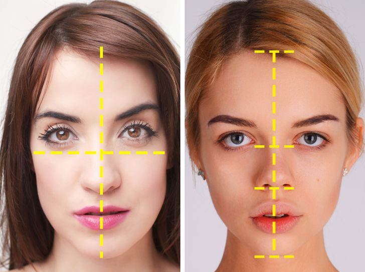 Учитываются и другие измерения: от нижней точки подбородка до кончика носа, от кончика носа до точки между глазами и от точки между глазами до линии роста волос на лбу. Если все 3 показателя равны, человек считается красивым.