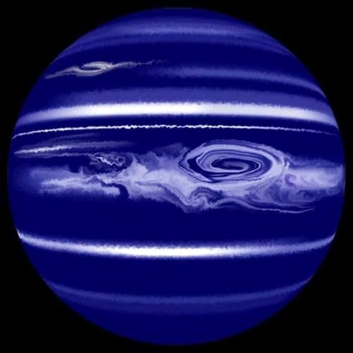 Газовая гигантская планета Солнечной системы является восьмым по близости к Солнцу небесным телом. Диаметр Нептуна — 49 000 км, а масса в 17 раз превышает земную. У него есть мощные облачные полосы (их, вместе со штормами и циклонами, сфотографировал «Вояджер-2»). Скорость ветра на Нептуне достигает 600 м / с. Из-за своего большого расстояния от Солнца, планета является одной из самых холодных, температура в верхних слоях атмосферы достигает минус 220 градусов Цельсия.