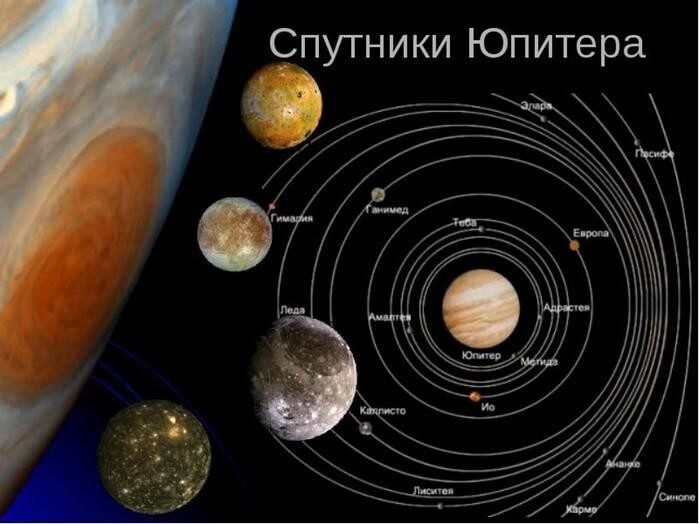 На Ио бушуют вулканы; на Европе существует подледный океан и, возможно, в нем есть жизнь; Ганимед — наибольший из спутников в Солнечной системе, и обладает собственной магнитосферой; а у Каллисто самая низкая отражательная способность из четырех галилеевых спутников. Есть версия, что поверхность этой луны состоит из темной, бесцветной скалы.