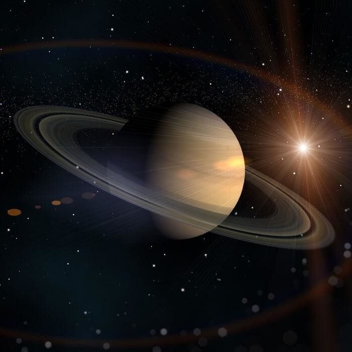 Вторая из наиболее крупных планет Солнечной системы известна своей кольцевой системой. Она была впервые замечена Галилео Галилеем в 1610 году. Галилео считал, что Сатурн сопровождается двумя другими планетами, которые находятся по обе стороны от него. В 1655 году Кристиан Гюйгенс с помощью усовершенствованного телескопа сумел разглядеть Сатурн достаточно подробно, чтобы предположить, что вокруг него находятся кольца. Они простираются от 7000 км до 120 000 км над поверхностью Сатурна, который сам имеет радиус в 9 раз больше, чем Земля (57 000 км) и массу в 95 раз больше Земли.
