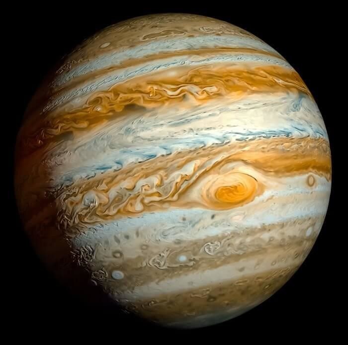 Атмосфера Юпитера состоит из газов, в основном из гелия и водорода, поэтому его также называют газовый гигант Солнечной системы. Поверхность Юпитера состоит из океана жидкого водорода.