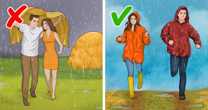 Если вы пошли в поход и над вами внезапно разразилась гроза, нельзя бежать плотной группой. Да, нужно искать убежище, но идите не спеша и на расстоянии в паре метров друг от друга. Ищите невысокие деревья с густыми кронами. Если вы в горах, постарайтесь спуститься с возвышенностей. Если вы в поле, не прячьтесь в стоге сена — туда может ударить молния. Когда укрытия нет — придется лечь или сесть на землю. Сядьте, согните ноги, голову опустите на колени — так будет безопаснее. Чтобы защититься от влажной почвы, подложите под себя полиэтиленовый пакет, лапник и т. п. Все металлические предметы (и отключенный телефон) положите от себя на расстоянии от 15 метров.