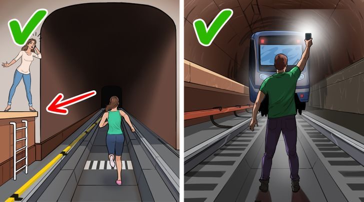 Вот что надо сделать: кричите, просите о помощи: пусть персонал сообщит машинисту поезда, что человек на путях. Идите в сторону, противоположную той, откуда появится поезд. Там будет «зебра», нарисованная на полу и стене. Именно возле нее останавливается первый вагон состава. Привлеките внимание машиниста: кричите, машине руками с включенным экраном телефона.
