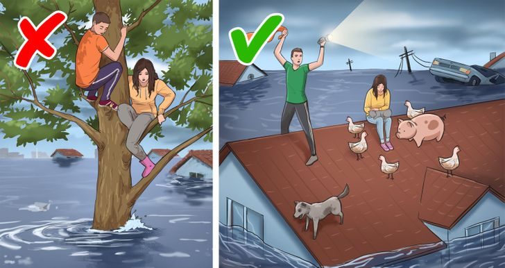 При внезапном наводнении не паникуйте. Надо быстро занять ближайшее безопасное возвышенное место. Когда это невозможно, поднимайтесь на верхний этаж или чердак дома. Если это частный дом, спасатели рекомендуют забраться на крышу и привязать детей и пожилых к печной трубе. Лезть на деревья, столбы и хлипкие постройки нельзя — вода может подмыть их, и они рухнут.