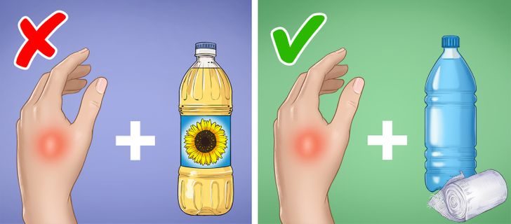 Наверное, даже дети знают, что делать при ожогах, но мы напомним. Не пользуйтесь бабулиными методами: ничего не намазывайте и не пшикайте. Трогать ожог руками не стоит, как и не следует отрывать прилипшую к месту ожога ткань.