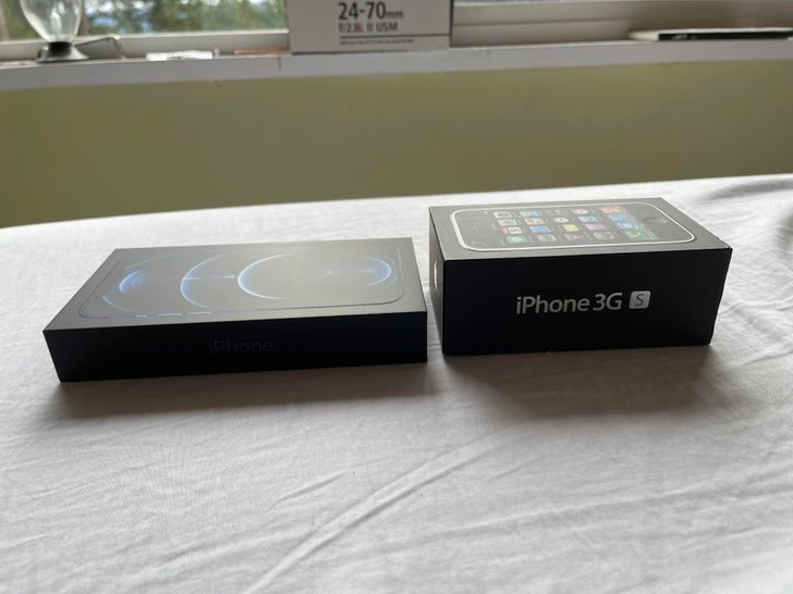 Разница между тем, как менялась толщина упаковки смартфона, на примере iPhone 12 Pro Max и iPhone 3GS