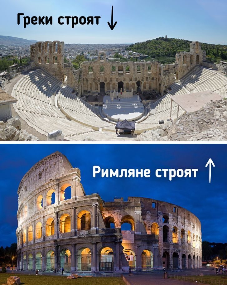 Различия в том, как строились амфитеатры греков и римлян