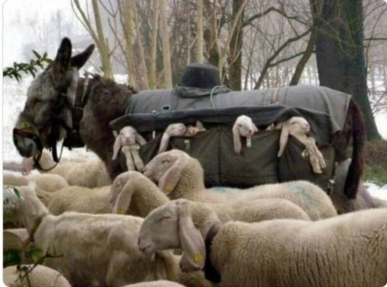 В Италии осликов-нянь дрессировали для того, чтобы они перевозили ягнят до пастбища