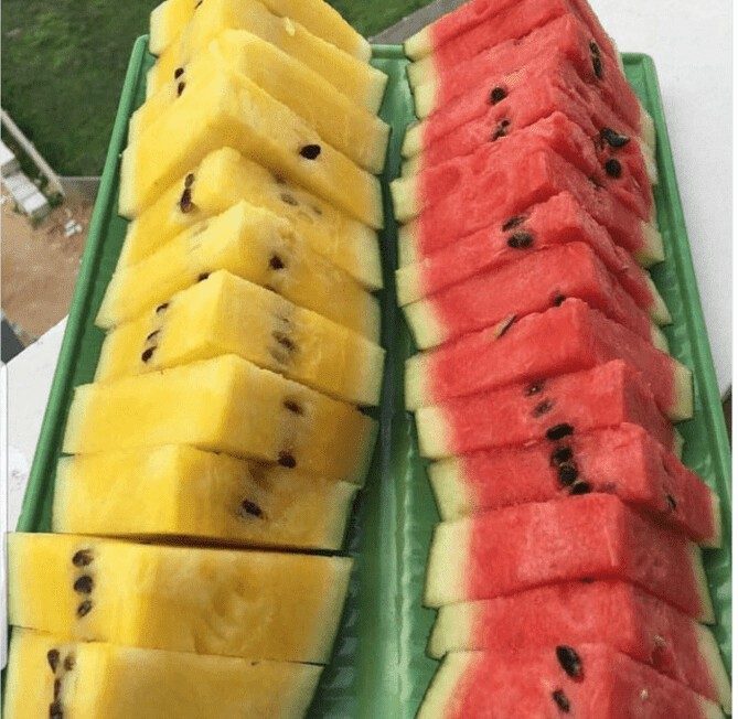 А вы знали, что существует желтый арбуз? Это плод скрещивания дикого арбуза (у него желтый цвет мякоти) и его окультуренного вида