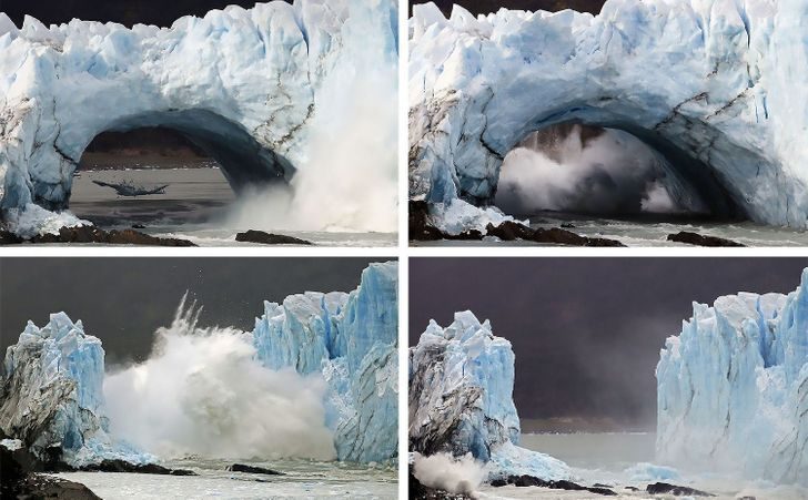 Как можно видеть на этих фотографиях, глыбы льда падают в воду и огромные массы ледника Перито-Морено (Аргентина) разрушаются.