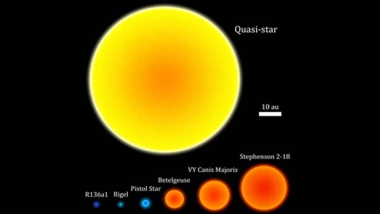 Другая теория, которую считают более вероятной, предполагает, что к образованию супермассивных чёрных дыр причастны квазизвёзды. В первый миллиард лет вселенной большие облака гелия и водорода плавали повсюду. Если бы вещество, содержащееся в этих облаках, разрушилось бы достаточно быстро, то оно могло бы образовать звезду с небольшой чёрной дырой в центре — квазизвезду, превосходящую солнце в яркости в миллиард раз. Обычно на этом этапе звезда становится сверхновой, в результате чего оболочка звезды разлетается в космосе. Но если вещество, окружающее звезду достаточно большое и плотное, оно будет противостоять взрыву и понемногу отправляться в чёрную дыру. Таким образом, чёрная дыра будет поглощать оболочку вещества, окружающего звезду, и со временем станет невообразимо большой и очень быстро.