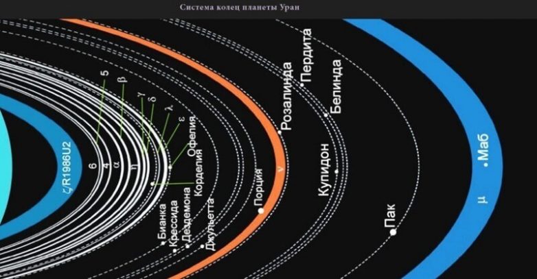 У Урана есть два набора колец. Внутренняя система из девяти колец состоит в основном из узких, темно-серых колец. Есть два внешних кольца: самое внутреннее – красноватое, как пыльные кольца в других частях Солнечной системы, а внешнее кольцо – синее, как кольцо Е Сатурна.В порядке увеличения расстояния от планеты, кольца называются Зета, 6, 5, 4, Альфа, Бета, Эта, Гамма, Дельта, Лямбда, Эпсилон, Ну и Му. Некоторые из больших колец окружены поясами мелкой пыли.