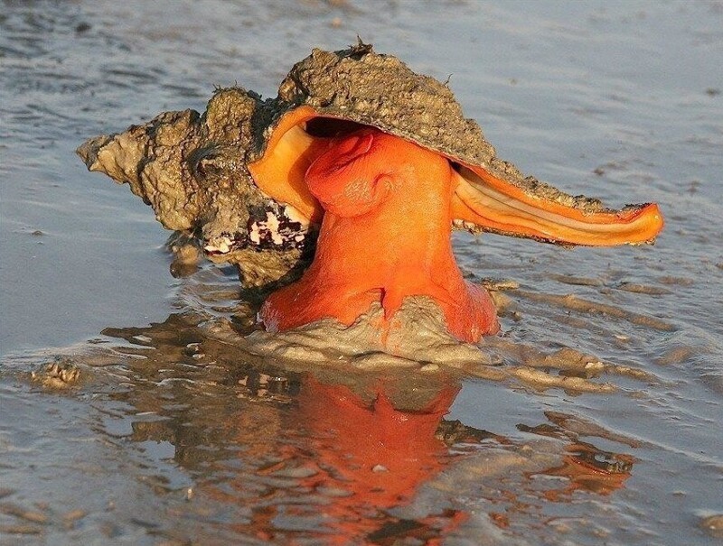 Нежась в водах Мексиканского залива, рыжая бестия освоила прибрежную зону с гладким песочным дном без камней и скал, в хорошо прогретой воде на глубине 5-8 метров. Почему рыжая? Потому что мускулистая ножка у неё ярко-оранжевая. Почему бестия? Потому что своей конечностью флоридская улитка не только передвигается, но и плющит тех, кто рискует пошутить про её конские размеры.
