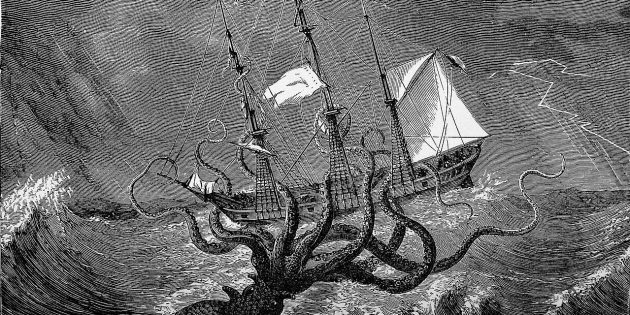 Реальность. Гигантские кальмары существуют в действительности. Правда, страх моряков, у которого «глаза велики», немного преувеличил их размеры. Самые крупные экземпляры этого вида достигают в длину 13 м и весят около 275 кг. Кальмар может перевернуть небольшую лодку, приняв её за добычу, но корабли топить не в состоянии.