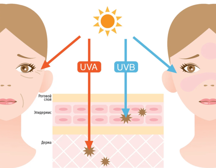 Ультрафиолетовые лучи солнца повреждают ДНК наших клеток. Следует оговориться, что существует два типа солнечных лучей — UVA и UVB. Первые проникают в дерму, повреждают коллагеновый каркас и ускоряют старение. UVB способны буквально сваривать эпидермис, вызывая солнечный ожог.Наши клетки способны исправить повреждения, вызванные солнечными лучами, но со временем они накапливаются. В результате кожа быстрее стареет, а к некоторых людей может развиться даже рак.