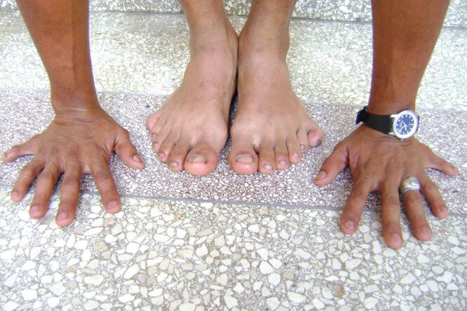 Что объединяет Хэлли Берри, Опру Уинфри, английскую королеву Анну Болейн и участника группы Slipknot Сида Уилсона? У всех этих знаменитостей был один диагноз — полидактилия, анатомическое отклонение, характеризующееся большим, чем в норме, количеством пальцев на руках или ногах. Настоящий рекордсмен среди носителей полидактилии — индийский мальчик Акшат Саксен. У парня 34 (!) пальца: по 7 пальцев на каждой руке и по 10 пальцев на каждой ноге. Представляете, какие соло можно выдавать на гитаре или фортепиано с такой мутацией? Правда, как правило, дополнительный палец представляет собой небольшой кусочек мягкой ткани, которую можно удалить. Иногда это просто кость без суставов, очень редко лишний палец бывает полноценным.