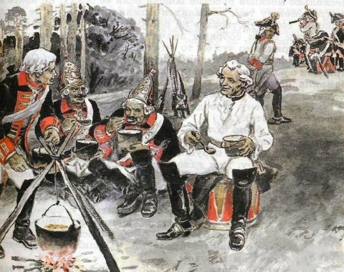 При этом Александр Васильевич пошел дальше и снял с солдатских плеч заботу о переноске продовольствия. Более того, он фактически изобрел полевую кухню, которая должна была следовать не за армией на походе, а перед армией. В результате получалось так, что перед пешими войсками шел арьергард, который занимался разведкой и подготовкой мест для привала. За ним шла с небольшим обозом полевая кухня. Далее маршировали суворовские войска. И только в самом конце армию догонял обоз.