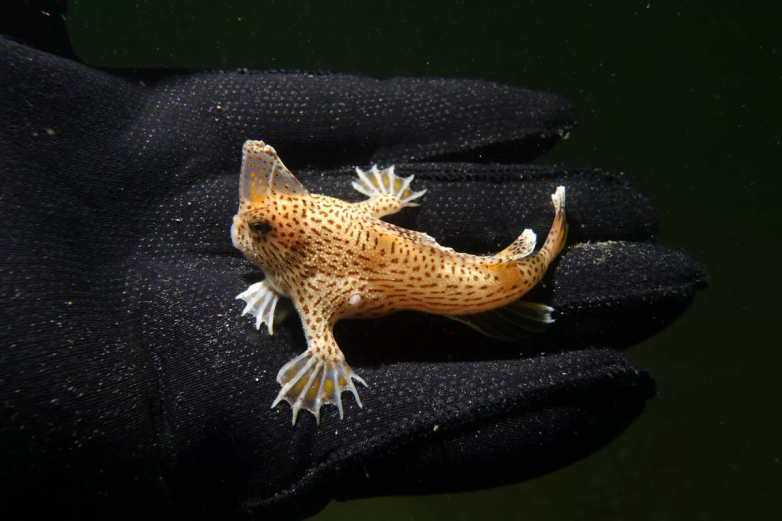 Типичный обитатель качалки 10 миллионов лет назад, гравюра.Широко растопырив плавники, рыба натурально ползёт по дну самолично пояснять креационистам за эволюцию. Их конечности настолько стали походить на сухопутные, что за бугром им даже название дали соответствующее — Handfish (рыба-рука). Что тут скажешь: маленький шаг для рыбы-лопаты, но огромный шаг для жабродышащих!