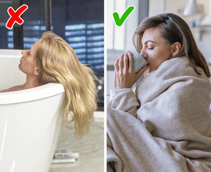Несомненно, теплая ванна или душ позволяют быстро согреться. Однако резкое изменение температуры может повредить нашей коже и слизистым оболочкам. Лучше всего выпить что-то теплое, и не сидите на месте — двигайтесь.