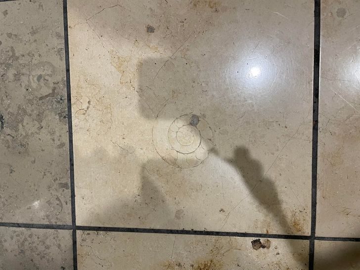 «Моя 4-летняя дочь — большой любитель динозавров. И вот что она нашла в плитке местного аэропорта. Это древний аммонит»