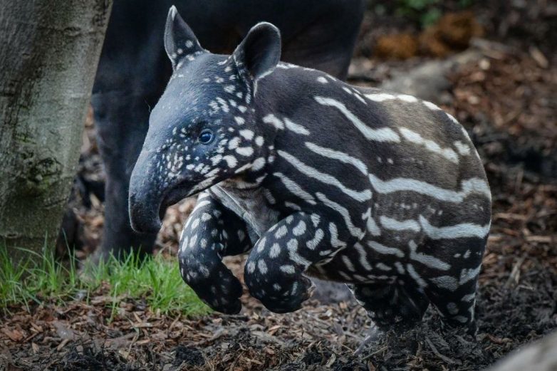 Малыш-тапир делает тыгыдык. Они, в отличие от родителей, маскируются не под камни, а под густую растительность джунглей.