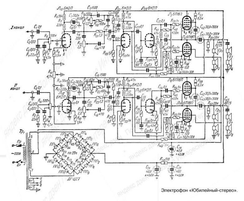 Стерео усилитель электрофона, за счет выходного каскада на лампах 6П18П, выдавала мощность 2х12 Вт. Двухполосные акустические колонки, по 4 динамика каждая, имели полосу 70...12000 Гц, что очень прилично для тех лет. К сожалению, вскоре схему упростили для снижения себестоимости.