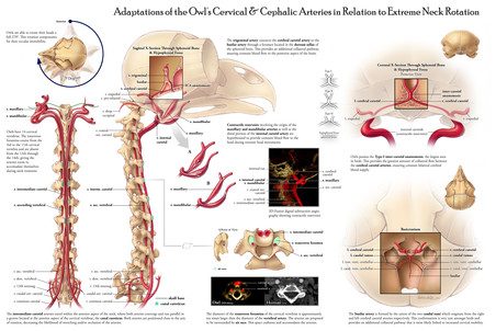 Помимо этого, как выяснилось, позвоночная артерия у сов входит в шейный отдел через 12-й, а не 14-й позвонок, то есть выше, чем у других птиц, что также сообщает ей дополнительную степень свободы при сильных и резких поворотах головы.