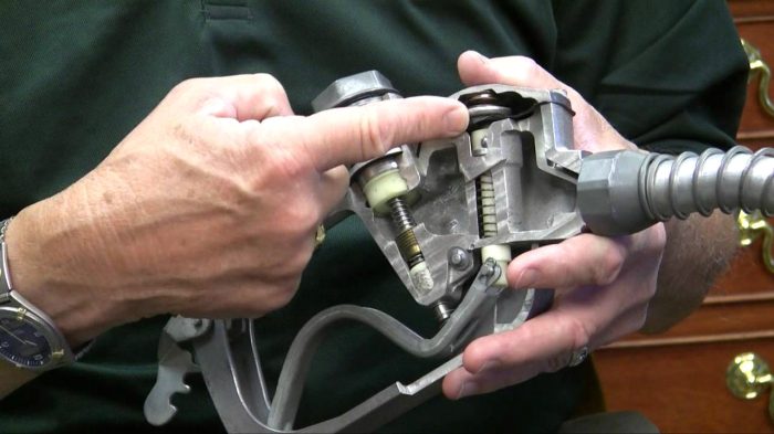 Поэтому заправочные пистолеты работают на чистой, стопроцентной механике! После того, как автомобилист нажимает на рычаг, он толкает шток клапана, открывая тем самым путь топливу к баку. Горючее течет через узкое кольцо, которое постоянно увеличивает скорость потока за счет снижения давления жидкости (эффект Вентури). Кстати, такая же технология используется в карбюраторах, аэрографах и пульверизаторах.