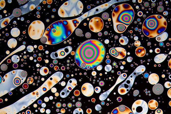 Цель художника — с помощью света увидеть необычные стороны привычных предметов: снежинок, мыльных пузырей, пищевых красителей, а также бактерий, кристаллов и ферромагнитной жидкости.