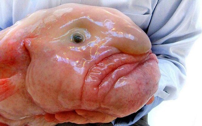 4. Рыба-капля — глубоководная морская рыба, которая обитает у побережья Австралии и Тасмании. Печальная рыба с человеческими чертами довольно безобидна: питается лишь тем, что попадает в ее широко раскрытый рот. Размеры такой «капли» — примерно 30 см в длину.