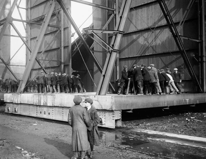 Мужчины открывают двери ангара, в котором находится R33. 1919 г.