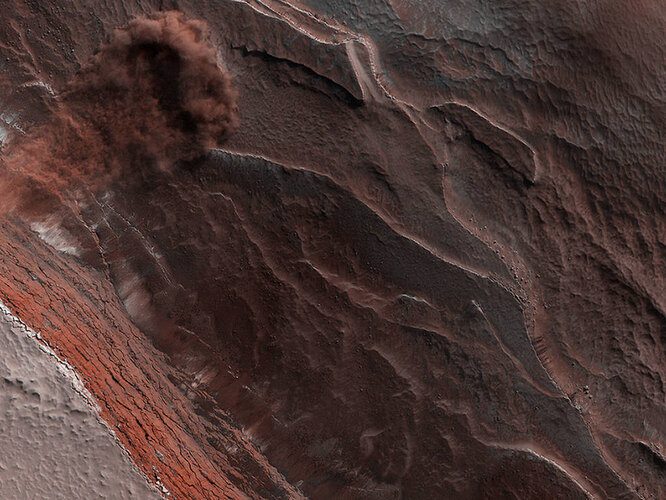 Также однажды HiRISE смог захватить спуск лавины. Когда весной испарялся сезонный лед, утесы высотой в 500 метров на Северном полюсе Марса начали разрушаться. Эти скалы могут рассказать ученым о тайнах истории планеты. Подобно кольцам деревьев, каждый слой льда имеет свою историю.