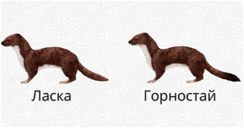 Внешне эти зверьки весьма похожи — они даже окрашены одинаково — летом коричневато-буроватые, зимой белые. Однако ласка меньше горностая (иногда в 2 раза), у горностая кончик хвоста темный, а сам хвост длиннее, чем у ласки. Различить ласку и горностая можно также по длине прыжка: у первой при неторопливом движении он равен 25 см и увеличивается вдвое при ускорении.