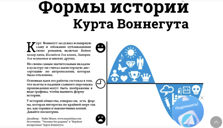 Дело в том, что структура истории лежит в основе большинства наших социальных коммуникаций — от переписки до разговоров по телефону. И хотя реальная жизнь слишком сложна, чтобы ее можно было изобразить на диаграмме каким-либо осмысленным образом, Воннегут предположил, что умение видеть взлеты и падения персонажей может помочь читателям оценить происходящее в их собственной жизни.