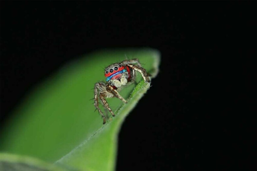 Род аранеоморфных пауков из подсемейства Aelurillinae в семействе пауков-скакунов. Дабы не пугать людей, страдающих арахнофобией, следует заметить, что обнаружен он был в индийском заповеднике для тигров. Своими радужно-голубыми усиками он привлекает партнеров. Если вы собираетесь не бояться какого-то одного паука, то пусть это будет он.