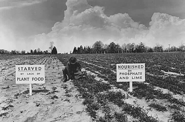 На фотографии ниже наглядно показано, насколько сильно удобрения влияют на урожай. Снимок был сделан в 1942 году, на одном из полей американского штата Теннесси. Справа показана удобренная почва с хорошим урожаем, а слева — почва без удобрений, на которой почти ничего не выросло.