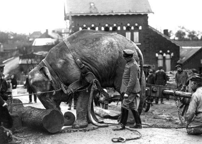 Индийский слон из Гамбургского зоопарка, используемый немцами во Франции для перемещения стволов деревьев, 1915
