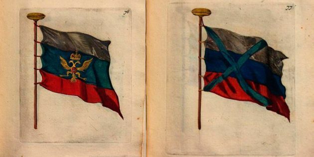 Иллюстрация: российские знамёна из книги Карла Алларда «Новое голландское корабельное строение», 1695 год