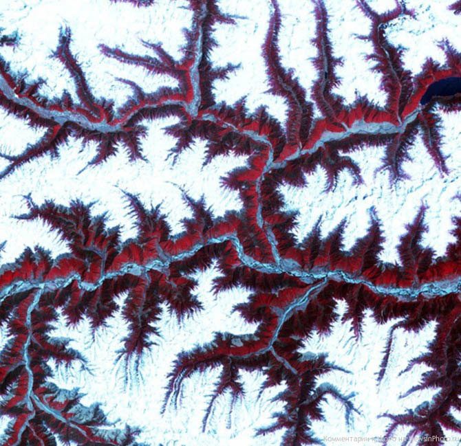 Спектрозональная обработка фотографий со спутника сотрудниками НАСА превратили обычные снимки нашей планеты в фотографии совершенно иного мира, сопоставимого с миром научной фантастики. Пурпурные океаны и оранжевые горные выступы. Это произошло благодаря использованию сверхчувствительного радиометра ASTER, который сочетает ближнюю инфракрасную область, красные и зеленые волны.