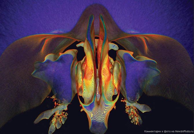 Эта фотография называется «Что кроется за нашим носом?». Она взяла приз в 2007 году на Международном конкурсе научной и инженерной визуализации (International Science & Engineering Visualization Challenge). Доктор Кай-Хунь Фунем из госпиталя Pamela Youde Nethersole Eastern Hospital в Гонконге создает восхитительные фотографии с помощью компьютерной томографии (КТ). Снимки получены в результате сканирования щитовидной железы пациента. Для создания кадра полости носовых пазух использовалось около 200 снимков КТ.