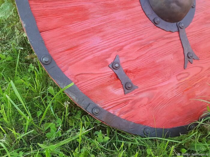 Также умбон выступал в качестве элемента, повышающего прочность конструкции. Через него шли заклепки или гвозди. На тыльной стороне щита имелась рейка, которая выступала ребром жесткости. Нередко приделывались кожаные ремни, для переноски щита за спиной или на плече. Даже по этому описанию должно быть понятно: данный элемент снаряжения в викинга исполнении был вещью исключительно незамысловатой.