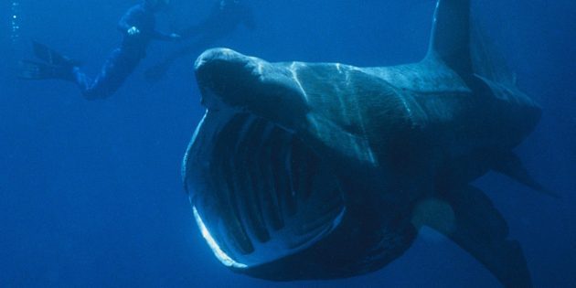Гигантская акула кормится. Она не может укусить, потому что у неё нет зубов