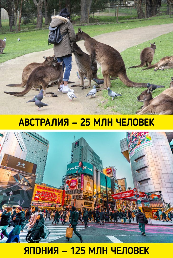 Несмотря на то что размер Японии составляет около 4,9 % площади Австралии, население Японии почти в 5 раз больше, чем в Австралии