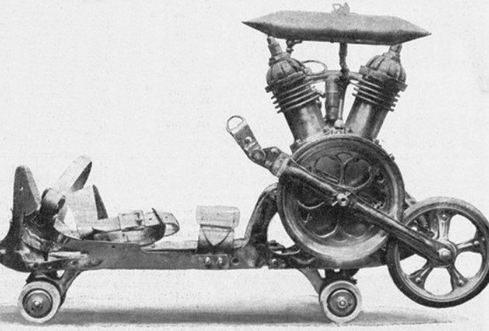 В 1905 году мир увидел новое изобретение — самоходные роликовые коньки. Их оснастили слабеньким моторчиком, а к поясу роллера прикрепили аккумулятор и выключатель. Спустя пару лет ролики усовершенствовали. Двухтактный моторчик остался только на одной ноге, а его мощность составляла целых 1,25 лошадиных сил. Изобретатель уверял, что ролики могут разогнаться до 30 км/ч, что в те времена было огромной скоростью. Топлива хватало примерно на 50 км пути.