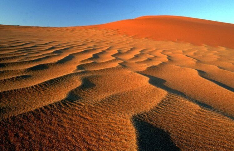 Намиб — это прибрежная пустыня в юго-западной части Африки. Ее площадь равна 100 тысячам квадратным километрам, поэтому она тоже не самая большая в мире. Зато она является самой древней, потому что образовалась около 55 миллионов лет назад. Толщина песка в Намибе на ровных местностях составляет около 30 метров, а вот высота песчаных дюн может достигать 380 метров.