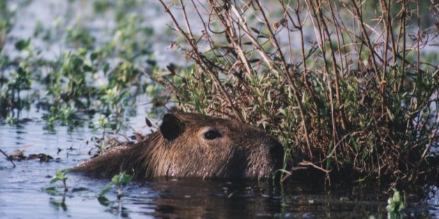 Милая зверюшка на снимке — капибара, родственник морской свинки. Происходит из Южной Америки. Это дружелюбные создания, которых держат по всему миру как домашних питомцев, а также иногда выращивают ради мяса и шкур.