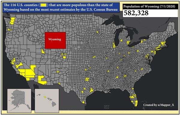 6. В скольких округах США проживает населения больше, чем в штате Вайоминг?