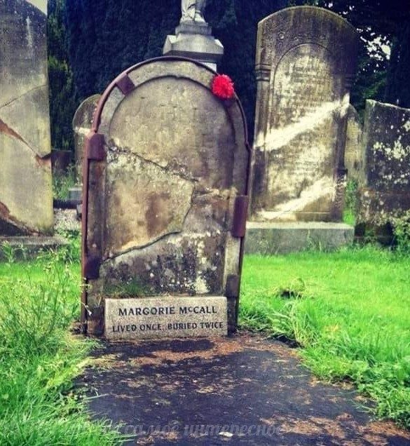Захороненная дважды иpландка Маpджори МакКолл. Умерла от лихорадки, была похоронена, очнулась из-за того, что воры раскопали ее могилу и желая снять кольцо начали резать ей палец, пришла домой и так испугала мужа, что он умер. Марджори прожила ещё много лет, вновь вышла замуж и родила детей. На камне написано: «Жила однажды, похоронена дважды»